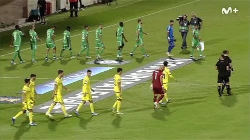 比賽正式開始之前兩支球隊相繼出現在了比賽場地之中,然而出現在比賽中圈場地中的比利亞雷亞爾運動員卻只有9名,通過仔細查看后,發現曼迪和阿克霍瑪奇這兩名運動員并沒有在場,而這兩名運動員都是在為以色列進行默哀的時候選擇離場的。