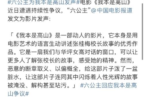 央視6公主表示《我本是高山》這部電影非常的感人,電影的本身采用藝術性的語言將張桂梅校長的故事生動的講述出來,開啟了一扇讓人們能夠與華坪女高進行對話的窗口。能夠讓更多的人深入的去了解張桂梅校長的事跡,真正的去感受張桂梅校長的精神。網絡上所出現的這些誤解和惡意的攻擊是不應該出現的。網絡上有很多惡意的評論,都是以偏概全斷章取義的,這些評論給這部影片潑了臟水,但是卻不能真正的將影片中所表現出來的人性的閃光點淹沒。希望廣大觀眾在對待每一步國產佳作時都公平公正。不要因為某些人的以偏概全或者是斷章取義而錯過了真正精彩的內容。