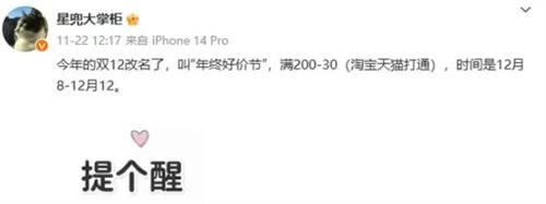 前幾日一名美妝博主@星兜大掌柜在11月22號發布的一篇帖子中也印證了淘寶最新發布的聲明,星兜大掌柜發文稱淘寶年終好價節的大促活動是滿200減30。活動具體舉辦的時間將會是在12月8號到12月12號,本次大促的時間是5天,淘寶和天貓也一起將會參與大促的優惠活動。
