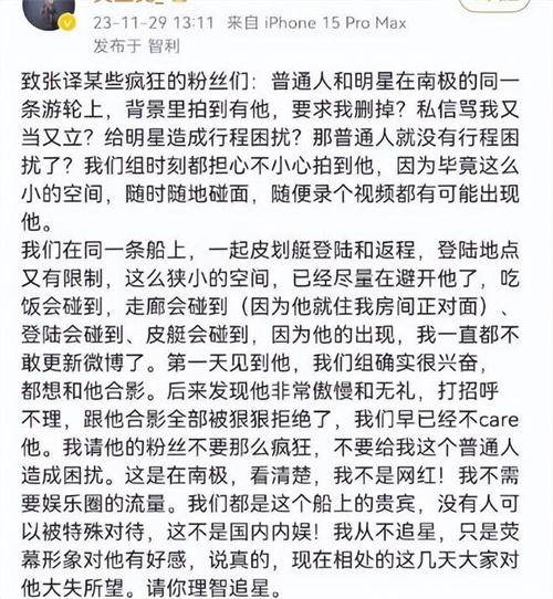 北京時間11月30日,近期娛樂圈的演員張譯由于拒絕網(wǎng)紅合影被罵傲慢,而這名網(wǎng)紅是在自己的社交平臺上面發(fā)文稱在南極偶遇到了張譯,想要跟他合照,但是被拒絕,還表示張譯十分的傲慢無禮。這名博主表示,他之所以知道張譯在船上面,是因為當(dāng)時船上還有一個美籍華人告知給他。在博主知道這件事情之后,想要主動找張譯合影,并且還告知張譯自己是某個品牌的創(chuàng)始人。