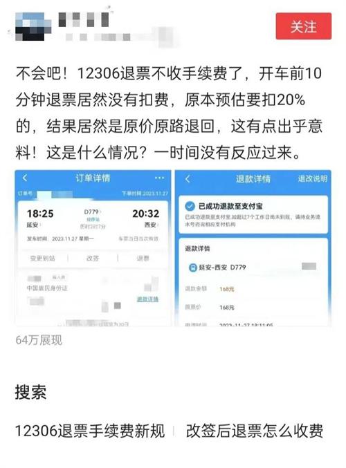 近日,在網(wǎng)上傳出來了一條火車票退票不扣手續(xù)費(fèi)的消息。這條消息在傳出之后也立刻引發(fā)了網(wǎng)友們的關(guān)注,據(jù)了解,這條消息是在北京時間的11月28日發(fā)布的,被網(wǎng)友在發(fā)布這條消息時表示自己購買了一張火車票,是自己在開車前10分鐘的時候直接把這張火車票給退了。系統(tǒng)在同意自己的退票之后,竟然沒有扣除自己退票的手續(xù)費(fèi),隨后這位網(wǎng)友并將自己在12306上退票,沒有扣手續(xù)費(fèi),一事在社交平臺上發(fā)布了出去,而在發(fā)布的時候還直接發(fā)送了兩張截圖。