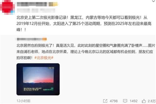 有網友表示在12月1號的時候,北京地區看到了極光,這也是整個北京城市歷史上第二次看到的極光現象,可以說是非常的難得的一個天氣奇觀,地磁暴活動的逐漸加強,極有可能會讓地球的大氣層會加熱,這就給航天飛行器在飛行的時候會造成非常多的困擾,飛行器在上升的過程當中,阻力會逐漸的變大,所以飛行速度有可能會降低,甚至有可能給航天器的安全造成極大的隱患,但地磁暴并不是非常嚴重的一個現象,它也可能會帶來一些比較好看的天氣景象,例如極光。