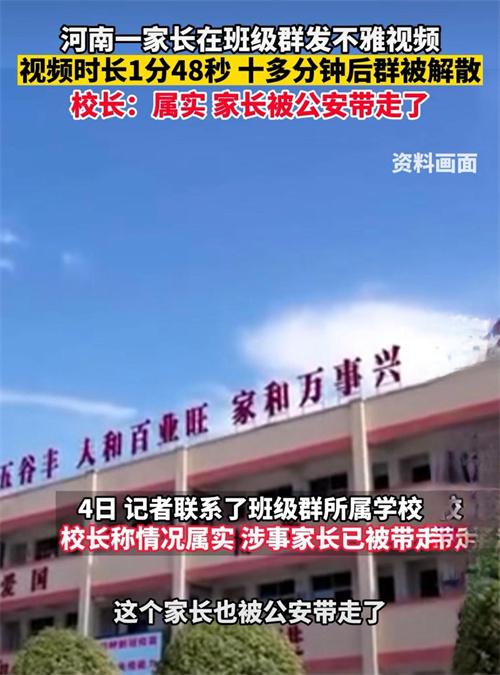 近日,在網上傳來一條消息,稱在河南省有某個班級群內有一名學生家長竟然在班級群內發送了一條不雅視頻。這條不雅視頻的時間長達1分鐘48秒,該條不雅視頻在班級群內剛剛發送,大約有10分鐘左右的時間之后學校的班級群就直接被解散了,這件事情在網上被發布之后,也立刻引發了網友們的多方討論。