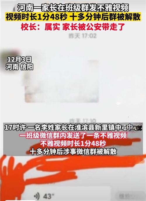 據了解,這起事件是在北京時間的12月3日的下午5點左右發生的,這件事情里面的學校則是河南省淮濱縣新里鎮中心學校,具有家長所上傳的群聊天記錄的截圖,顯示在當天下午的5點左右,有一名姓李的家長朋友。突然就在孩子所在的班級群內發送了一條時間長達1分48秒的不雅視頻。