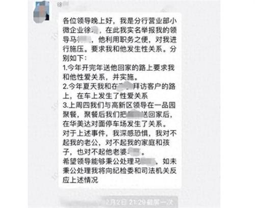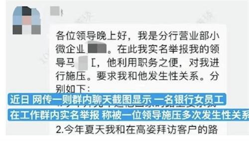 近日,網上流傳一家銀行女性員工在工作群里面實名舉報被領導多次施壓發生性關系。從網上流傳的聊天截圖顯示,這些信息是來自于一個100多人的銀行工作群,12月2日晚上九點左右,一名徐姓員工在群里面發了一段文字,聲稱是分行營業部的員工。實名舉報領導馬某利用職務之便對她施壓,而且還與自己發生了性關系。徐某還在群里面列舉了三次性關系發生的時間和地點。