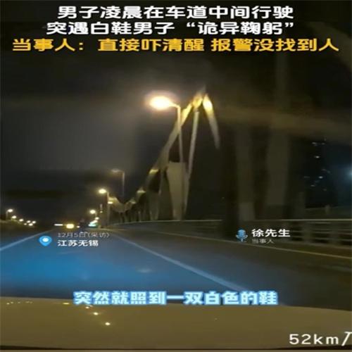 近日,一位姓徐的男子開車在行駛到江蘇省無錫市梁溪區的金匱大橋時,突然遇到了一起非常令人疑惑的事件。當事人徐先生表示自己開車在準備從金匱大橋下匝道的時候,突然卻發現自己車輛前方出現了一位穿著黑色上衣,白色球鞋的男子,后這位男子便做出了令人感覺到匪夷所思的舉動。只見這位男子將裝雙臂伸開之后便開始彎腰鞠躬,男子這種極其詭異的舉動,不禁的讓徐先生感覺到有一絲的震驚,徐先生在看到這個男子的行為之后,為了不和這個男子碰撞,便及時向右進行了變道。