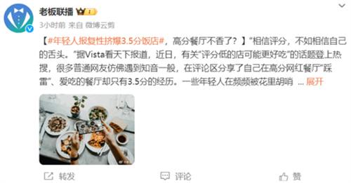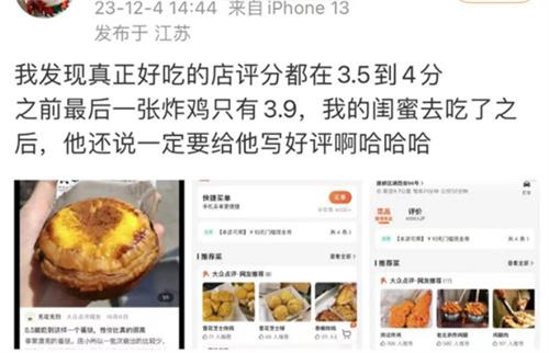 12月9日消息,近來這段時(shí)間很多年輕人恨透了評(píng)分虛高的網(wǎng)紅餐廳,開始報(bào)復(fù)性的擠入3.5分的飯店中。其實(shí)吃飯之前先打開手機(jī)看網(wǎng)上評(píng)價(jià)已經(jīng)成為很多年輕人的肌肉記憶,飯店在評(píng)分網(wǎng)站上的分?jǐn)?shù)指標(biāo)也隨之變得更加離譜,4.8的評(píng)分才算合格,4.5的評(píng)分才算勉強(qiáng)可以,如果是4分以下的評(píng)分,在很多人的腦海中恐怕都會(huì)生出難以下咽的感覺。
