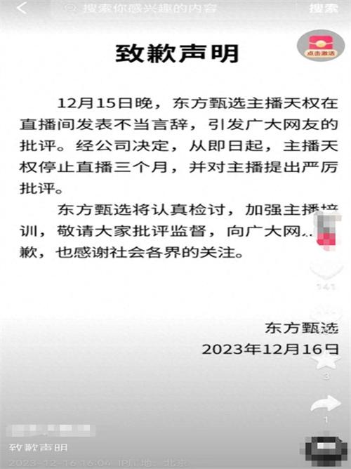 時(shí)間沒(méi)過(guò)多久,東方甄選對(duì)于主播天權(quán)的行為給出了嚴(yán)厲的處罰,并對(duì)外發(fā)布了一條對(duì)主播天權(quán)的處罰通知,處罰通知里面顯示對(duì)主播天權(quán)作出了禁止直播三個(gè)月的處罰。對(duì)主播天權(quán)特意進(jìn)行了嚴(yán)厲的批評(píng),所有被天權(quán)拉黑的網(wǎng)友們目前已經(jīng)全部被解除了,歡迎這些網(wǎng)友們能夠繼續(xù)對(duì)新東方提出建議以及批評(píng),在未來(lái)東方甄選將增加對(duì)主播的培訓(xùn),希望廣大網(wǎng)友能夠繼續(xù)對(duì)我們監(jiān)督。