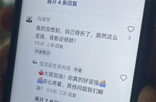 出院之后的向建軍通過社交平臺看到一位騎手摔傷之后醫(yī)藥費(fèi)沒有著落的消息,悄悄的捐了20塊錢向何自己有同樣經(jīng)歷的騎手默默加油打氣。