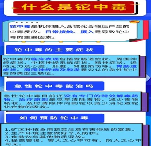 鉈中毒的患者一般在臨床上面的表現有腸道癥狀,神經癥狀,運動無力癥狀,肝臟癥狀,腎臟癥狀,這些都是非常典型的一個鉈中毒的一種癥狀。目前關于這種急性的鉈中毒還沒有研制出非常有效的解藥,對于鉈中毒的患者,最好的治療方式就是不斷的去清除體內的一些中毒物質,減少身體對于這些中毒物質的吸收,治療過程是相對比較緩慢。想要預防鉈中毒也是有一定方法,首先如果是在礦區生活和工作的市民,千萬不能夠去吃在礦區種植的一些蔬菜,這些蔬菜當中就有可能會含有這種中毒物質。其次,在生產環境的過程當中要注意好一些個人防護,例如帶好口罩或者戴好防護服。