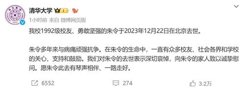 北京時(shí)間12月13日,清華大學(xué)在社交賬號(hào)上發(fā)布一篇微博稱1992級(jí)的校友租賃,因?yàn)殂B中毒在北京22日死亡。據(jù)了解,朱令在很長(zhǎng)一段時(shí)間都在和病毒做抗?fàn)帲谒詈蟠刮VH,仍然有很多校友以及學(xué)校的關(guān)心。大家都在不斷的鼓勵(lì)他和支持她,對(duì)于他的離世,所有人都感到非常的傷心,希望她的家屬能夠節(jié)哀,但是關(guān)于朱令中毒是牽扯到一個(gè)案件。