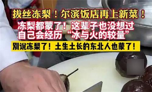 近日,黑龍江哈爾濱飯店推出“拔絲凍梨”,這一有趣的菜品讓整個東北都為之震撼,有網友稱“這道菜還是第一次聽說”。拔絲凍梨是按照其他拔絲菜品的做法,對凍梨進行烹飪,這道菜體現了東北特色食物的魅力,堪稱東北冬日里冰與火的完美結合。