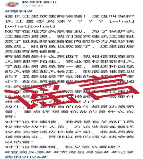 在1月13日的上午,有網(wǎng)友在社交平臺(tái)發(fā)布消息稱,四川宜賓出現(xiàn)了往長(zhǎng)江里面投放鱷雀鱔的情況,這個(gè)消息引發(fā)了網(wǎng)友的關(guān)注和討論。有網(wǎng)友在社交平臺(tái)上散布消息,稱是為了保護(hù)長(zhǎng)江的生態(tài)資源,所以往里面投放了包括鱷雀鱔在內(nèi)的50萬條珍稀魚類。對(duì)于這個(gè)消息,宜賓進(jìn)行了辟謠,表示活動(dòng)當(dāng)中投放的魚類是長(zhǎng)江鱘等一些瀕危物種,投放這些物種是為了恢復(fù)種群以及自然繁殖,讓其起到一個(gè)良好的促進(jìn)作用。鱷雀鱔是北美的一種魚類,屬于外來物種,如果放入長(zhǎng)江,會(huì)對(duì)長(zhǎng)江的生態(tài)產(chǎn)生破壞。