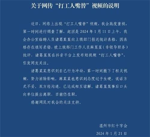 1月21日,一則溫州市紅十字會(huì)工作人員在辦公軟件發(fā)布語(yǔ)音,語(yǔ)音內(nèi)容引發(fā)了社會(huì)的廣泛關(guān)注,針對(duì)這一現(xiàn)象溫州市紅十字會(huì)迅速做出回應(yīng),并且表示將嚴(yán)肅處理此事件。在保護(hù)員工合法權(quán)益下對(duì)此事件進(jìn)行深入調(diào)查。