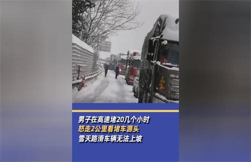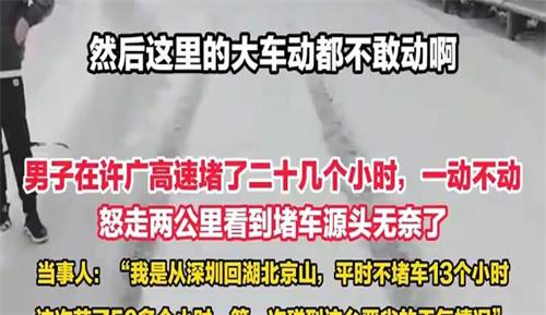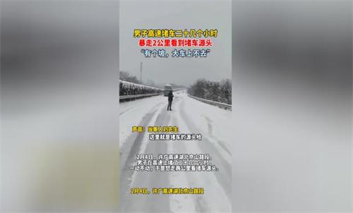 這名男子原本計劃從深圳返回老家,在通常情況下這段旅途需要13個小時,但是由于返鄉高峰期和連日的大雪,他不得不在高速上被堵了20多個小時,長時間的等待讓他覺得10分焦慮和無奈,他決定徒步查看堵車的源頭來尋求解決問題的辦法。在寒風刺骨的冬日里,他頂著風雪艱難的前行,踏著泥濘的道路,腳步雖然沉重,但內心卻充滿了堅定和決心,他希望能夠真正找到堵車的原因為其他司機提供有用的信息,幫助大家能夠盡早回家與家人團聚。在徒步兩公里之后,他終于找到了堵車的源頭,是由于大雪和路面結冰的影響,導致某些車輛出現故障,從而造成交通堵塞。
