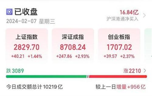 2月7日a股市場延續的前幾日反彈漲勢,滬指漲超過1%,收復2800點,截止到目前滬指漲1.44%報2829.7零點,深成指漲2.93%報8708.24點,創業板只漲2.37%報1707.02點,目前兩市合計成交達到了10,211元,在新的一年當中,滬深兩市的成交額,第1次的突破了萬億,北向資金凈買入1,684億元。