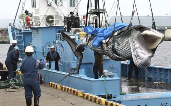 當(dāng)?shù)貢r間7月1日,日本正式重啟商業(yè)捕鯨,8艘捕鯨船先后從北海道釧路港及山口縣下關(guān)港出海,前往日本專屬經(jīng)濟區(qū)域內(nèi)進行捕獵。據(jù)共同社報道,當(dāng)天已有兩條小須鯨被捕獲。法新社報道稱,為了使這頭8.3米的小須鯨保持新鮮,它在岸邊就被開膛破肚,放干鮮血,之后漁民將其轉(zhuǎn)移到卡車上送往港口工廠,工人隨即將之切割解體,預(yù)計將于4日進入市場進行交易。