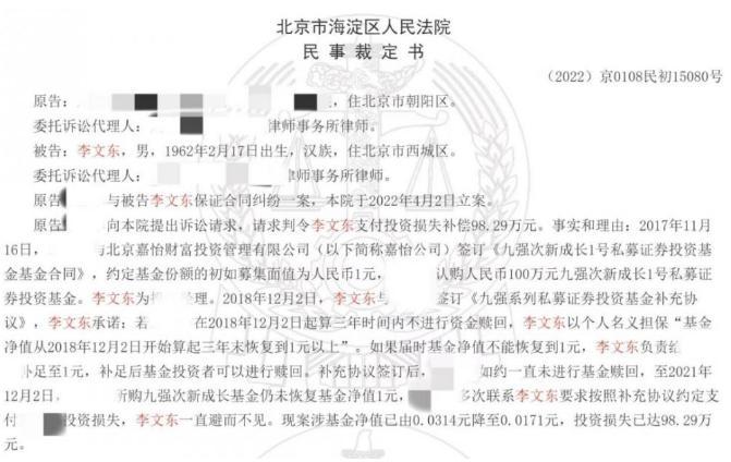 導讀 2023年的1月2日,中國裁判文書網公布了多份判決書北京嘉怡財富以及基金經理李文東被多位投資人投訴,送你世稱自己投資的基金100萬元。
