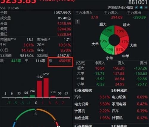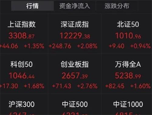 上證指數高開1.35%,報3308.87元,此次上漲,增加了44.06個百分點,深證成指報12229.38元,上漲幅度為2.08%,上漲了248.76個百分點,北證50報1010.96元,此次上漲幅度為0.94%,上漲了9.4個百分點,科創50,上漲幅度為1.68%,報1046.44,上漲了17.30個百分點,創業板指上漲幅度為2.76%,報2657.39元,上漲了71.43個百分點,中證500上漲幅度為1.29%,報6331.88,上漲了80.44個百分點,中證1000,報6815.14元,上漲了1.16%。