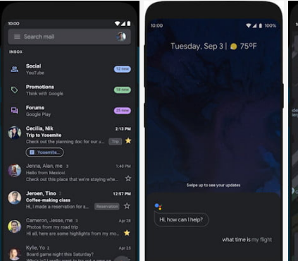 Google Maps和Google Assistant在某種程度上已經支持暗模式功能,但是,尚未完全提供支持。具有完全支持的更新可能很快就會向用戶推出。最初,Gmail也為暗模式添加了一些基本支持。例如,當Android 10的系統范圍內的黑暗模式開啟時,Gmail小部件可以在黑暗模式下工作,如果您在黑暗模式下打開Gmail應用程序,則會看到一個黑暗的啟動屏幕。現在,整個應用程序將允許使用深色主題。