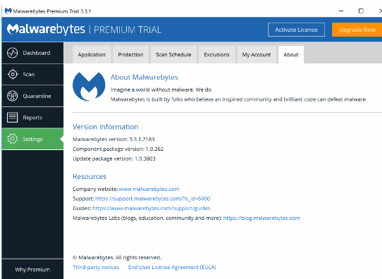 提示:您可以通過轉到Malwarebytes應用程序中的“設置”>“關于”來驗證程序,組件和更新軟件包的版本。