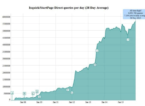 DuckDuckGo的訪問量從平均每天710萬次的每日搜索量攀升至一年中的超過1,120萬次的每日搜索量,并且Startpage / Ixquick也在2015年11月30日創(chuàng)下了歷史新高,每日搜索量首次突破600萬大關(guān)時(shí)間。