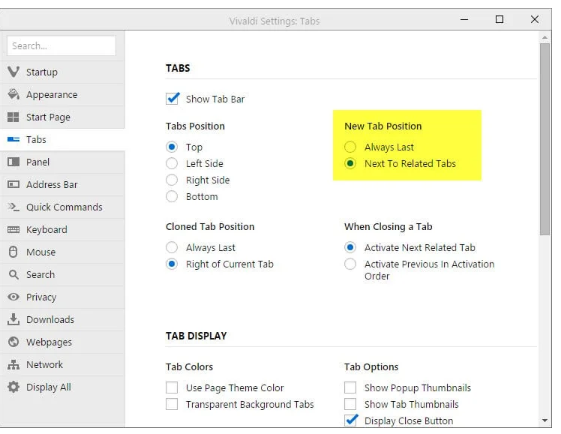 不喜歡Internet瀏覽器的新標簽頁打開行為的Vivaldi用戶可以在設置中還原經典方法: