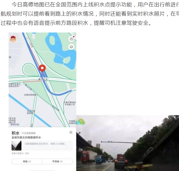 今日高德地圖已在全國范圍內上線積水點提示功能,用戶在出行前進行導航規劃時可以提前看到路上的積水情況,同時還能看到實時積水照片,在導航過程中也會有語音提示前方路段積水,提醒司機注意駕駛安全。