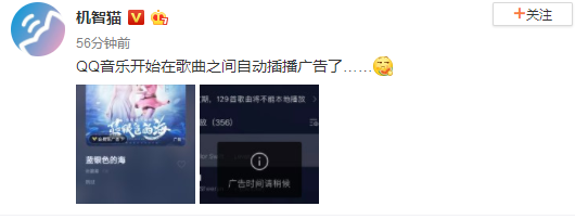 不過微博用戶@機智貓爆料稱,QQ音樂現在會在歌曲之間自動插播廣告,這就不一樣了。