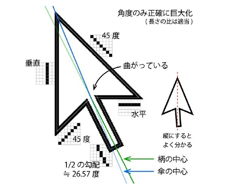 光標(biāo)可以分為傘、柄兩部分,各自都是左右對稱的,但合在一起就不對稱了,二者的中軸線并不完全重合,傘部分的斜線角度為45度,柄部分的兩條斜線卻是26.57度,因此兩條中軸線就有了4.07度的差異。把箭頭放直了就能很容易看出來,箭頭的尾巴向右彎了。