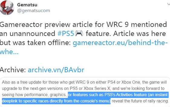 除了售價(jià)和發(fā)布日期,索尼 PlayStation 5 仍然有許多秘密沒有向外界公布,比如操作系統(tǒng)、用戶界面、以及新的軟件功能。 早些時(shí)候,西班牙 Game Reactor 博客披露了即將上市的《WRC 9》這款世界汽車?yán)﹀\標(biāo)賽游戲的一些細(xì)節(jié)。 盡管文章很快就被移除,但還是有眼疾手快的網(wǎng)友將關(guān)鍵信息摘抄了下來。