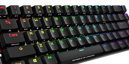 ROG Falchion是最有趣的。它是65%的緊湊型無線鍵盤,左側還具有一個交互式觸摸面板,可用于調節音量或播放和暫停音樂。您甚至可以使用它在屏幕上放大和縮小,這聽起來很漂亮。最重要的是,該面板可以編程為用作宏鍵,觸摸面板內部的RGB LED實時指示電池狀態。