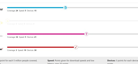 但是T-Mobile在全國范圍內的速度仍然很低。根據Ookla Speedtest Intelligence的數據,其速度為78Mbps,實際上是4G速度,因此無法提供我們所謂的全新5G體驗(請注意:Ookla由PCMag.com的母公司Ziff Davis擁有)。