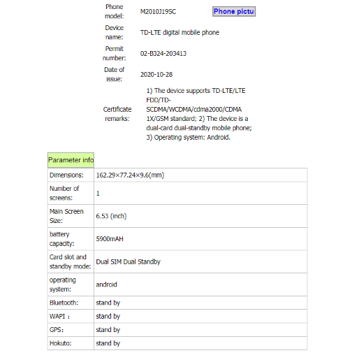 該M2010J19SC TENAA上市的國家,它的尺寸為162.29 X 77.24 X9.6毫米。該設備的圖像在清單中尚不可用。該手機具有6.53英寸的屏幕,并配有5900mAh額定容量的巨大電池作為后盾。它的典型容量似乎是6,000mAh。一些報道聲稱該設備可以稱為Redmi Note 10 4G或Redmi 10。