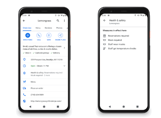 此外,Google Maps將顯示有關公司正在采取的預防措施的信息:是否要求訪客戴著口罩,結帳處是否有有機玻璃隔斷,員工是否進行溫度測量等等。