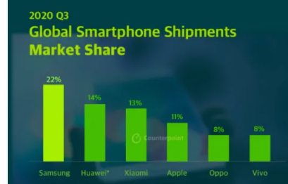 根據Counterpoint的研究,全球智能手機出貨量同比下降了4%,但環比增長32%,至2020年第三季度達到3.66億部。雖然三星保留了頭把交椅8040萬臺的出貨量,48%的環比增長,3%,同比增長。這顯然是三星過去三年來最高的出貨量。小米首次超過蘋果,排名第三。它貢獻了智能手機總出貨量的13%,比上一季度增長了75%。2020年第三季度,蘋果iPhone出貨量同比下降7%,這可能是由于這次iPhone年度發布推遲。包括榮譽在內的華為以14%的比例排名第二。
