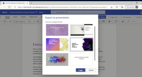 例如,只需在Word中為Web打開要轉換為演示文稿的文檔,然后在“文件”菜單中單擊“導出”,您應該會看到一個名為“導出為PowerPoint演示文稿”的新選項。