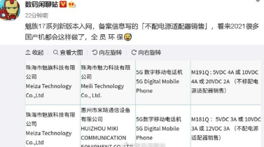 另外,從iPhone 12系列率先取消贈送充電器后,越來越多的手機廠商先后跟進。此前發(fā)布不久的小米11已經不贈送充電器,不過選擇權還是在用戶手中。現在入網信息顯示魅族17系列新版本將“不標配電源適配器銷售”,2021年可能將會有更多的國產手機會這么做。