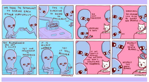 這個(gè)可愛的系列以大眼睛的藍(lán)色外星人為特色,他們對類地星球上的日常生活提供平庸的評論。漫畫涵蓋了各種主題和場景,從煮咖啡和打曲棍球,到在電子游戲中相互競爭的貓和朋友。憑借其對人類生活的輕松演繹,難怪這部漫畫在Instagram 上積累了超過 600 萬粉絲,或者 Apple 想把它變成一個(gè)節(jié)目。
