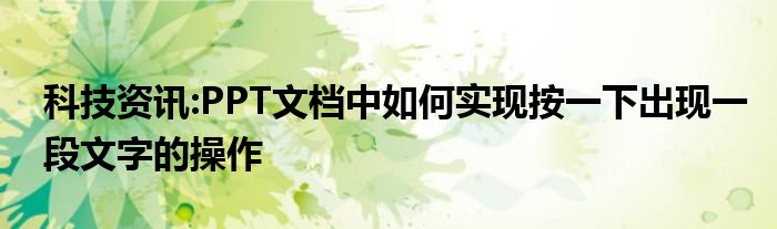 最近關(guān)于PPT文檔中如何實現(xiàn)按一下出現(xiàn)一段文字的操作在網(wǎng)上的熱度是非常高的,很多網(wǎng)友們也都是非常關(guān)注PPT文檔中如何實現(xiàn)按一下出現(xiàn)一段文字的操作這個事情,為此小編也是在網(wǎng)上進行了一番搜索查閱相關(guān)的信息,那么如果說有感興趣的網(wǎng)友們想知道具體的情況的話,小編就把自己所搜集到的一些信息分享給大家吧。