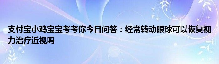 支付寶小雞莊園每日答題的答案是很多小伙伴們現在每天都必做的一件事,為自己的小雞賺取飼料,那么答題的過程當中很多小伙伴就會不知道答案,就好比今日的問題為支付寶小雞寶寶考考你今日問答:經常轉動眼球可以恢復視力治療近視嗎,那么大家不知道答案的情況下要是答錯了就領取不到飼料了,不過這里大家不需要擔心,小編就來給大家收集下支付寶小雞寶寶考考你今日問答:經常轉動眼球可以恢復視力治療近視嗎的答案,下面分享給大家吧。