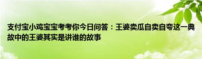 支付寶小雞莊園每日答題的答案是很多小伙伴們現在每天都必做的一件事,為自己的小雞賺取飼料,那么答題的過程當中很多小伙伴就會不知道答案,就好比今日的問題為支付寶小雞寶寶考考你今日問答:王婆賣瓜自賣自夸這一典故中的王婆其實是講誰的故事,那么大家不知道答案的情況下要是答錯了就領取不到飼料了,不過這里大家不需要擔心,小編就來給大家收集下支付寶小雞寶寶考考你今日問答:王婆賣瓜自賣自夸這一典故中的王婆其實是講誰的故事的答案,下面分享給大家吧。