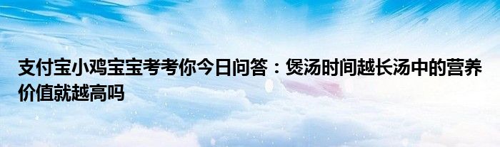 支付寶小雞莊園每日答題的答案是很多小伙伴們現在每天都必做的一件事,為自己的小雞賺取飼料,那么答題的過程當中很多小伙伴就會不知道答案,就好比今日的問題為支付寶小雞寶寶考考你今日問答:煲湯時間越長湯中的營養價值就越高嗎,那么大家不知道答案的情況下要是答錯了就領取不到飼料了,不過這里大家不需要擔心,小編就來給大家收集下支付寶小雞寶寶考考你今日問答:煲湯時間越長湯中的營養價值就越高嗎的答案,下面分享給大家吧。