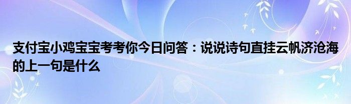 相信現在大家對于小雞莊園每日問答都是非常關心的吧,并且近期發現很多小伙伴都很想知道支付寶小雞寶寶考考你今日問答:說說詩句直掛云帆濟滄海的上一句是什么這個問題,那么既然現在小伙伴們對于支付寶小雞寶寶考考你今日問答:說說詩句直掛云帆濟滄海的上一句是什么都是非常好奇的,小編今天就在網上收集了一些關于支付寶小雞寶寶考考你今日問答:說說詩句直掛云帆濟滄海的上一句是什么的一些相關信息,下面就由小編來給大家分享下吧。