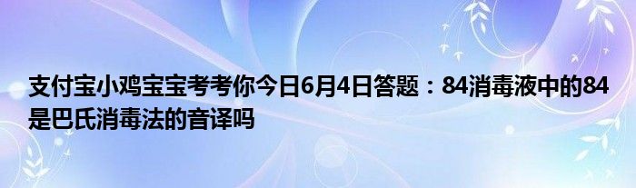 支付寶小雞莊園每日答題的答案是很多小伙伴們現在每天都必做的一件事,為自己的小雞賺取飼料,那么答題的過程當中很多小伙伴就會不知道答案,就好比今日的問題為支付寶小雞寶寶考考你今日6月4日答題:84消毒液中的84是巴氏消毒法的音譯嗎,那么大家不知道答案的情況下要是答錯了就領取不到飼料了,不過這里大家不需要擔心,小編就來給大家收集下支付寶小雞寶寶考考你今日6月4日答題:84消毒液中的84是巴氏消毒法的音譯嗎的答案,下面分享給大家吧。