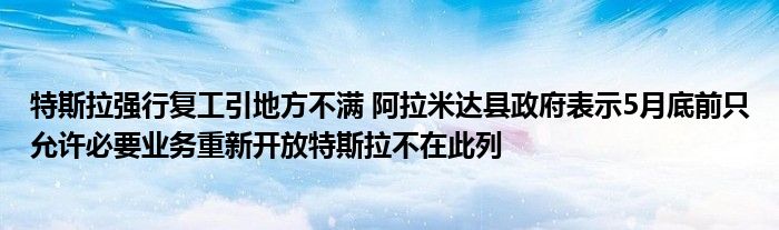 上周末,特斯拉強行復工,位于加州阿拉米達縣的一座工廠恢復了生產,特斯拉CEO馬斯克這一決策引地方不滿,阿拉米達縣政府表示, 5月底前只允許必要業務重新開放,特斯拉不在此列。