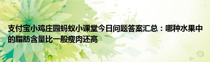 相信現在大家對于小雞莊園每日問答都是非常關心的吧,并且近期發現很多小伙伴都很想知道支付寶小雞莊園螞蟻小課堂今日問題答案匯總:哪種水果中的脂肪含量比一般瘦肉還高這個問題,那么既然現在小伙伴們對于支付寶小雞莊園螞蟻小課堂今日問題答案匯總:哪種水果中的脂肪含量比一般瘦肉還高都是非常好奇的,小編今天就在網上收集了一些關于支付寶小雞莊園螞蟻小課堂今日問題答案匯總:哪種水果中的脂肪含量比一般瘦肉還高的一些相關信息,下面就由小編來給大家分享下吧。