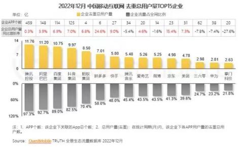 2月21日國內知名的大數據服務商 Quest Mobile發布了《2022年中國移動互聯網年度報告》,該報告中指出,截止2022年12月,中國移動互聯網用戶規模人口已經突破12億大關。用戶的粘性也在逐步增強月,人均時長和使用次數,分別突破177.3小時以及2633次。51歲以上用戶占比已經達到26.4%,突破1/4關口,三縣級以下城市用戶占比高達60.6%,突破6成關口。