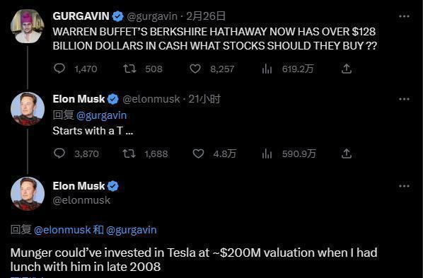 股神沃倫巴菲特旗的投資公司伯克希爾哈薩維公布了2022年全年和第四季度的財報,稱目前巴菲特的現金儲備額達到了1,290億美元。對于巴菲特手中持有如此多的現金,有些網友在推特上問道,他們應該買什么股票?針對這一問題,特斯拉首席執行官馬斯克給予回復稱,希望這家控股公司能夠投資以t開頭的公司,暗指特斯拉。