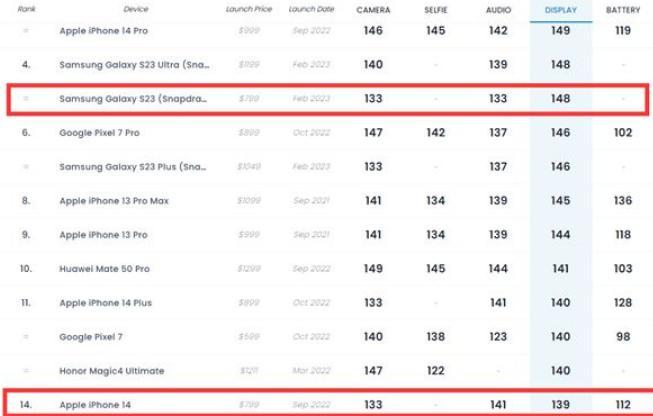 近期三星GalaxyS23系列手機已經全系發布,眾多手機測評博主針對該系列的手機做出了一些測評。據了解,在測評報告中三星galaxyS3的Dxo屏幕跑分總分達到了148分,很多人不懂這個跑分的含義,要知道蘋果最新推出的iPhone 14這項跑分只有139分,單憑此項成績已經碾壓了iPhone 14的屏幕效果,成為了眾多手機跑分榜單的第四名。